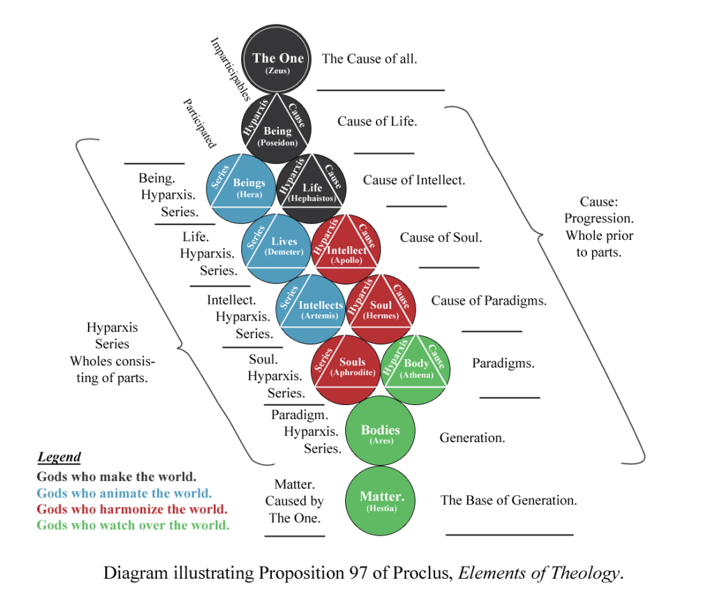 The series participates in the nature of the hyparxis-god from whom they’ve take their form and in the essence of the serial-goddess from whom they are generated. It is by this the dodekatheon becomes the causes as per Proclus’ hierarchy of causes, detailed in the above image.